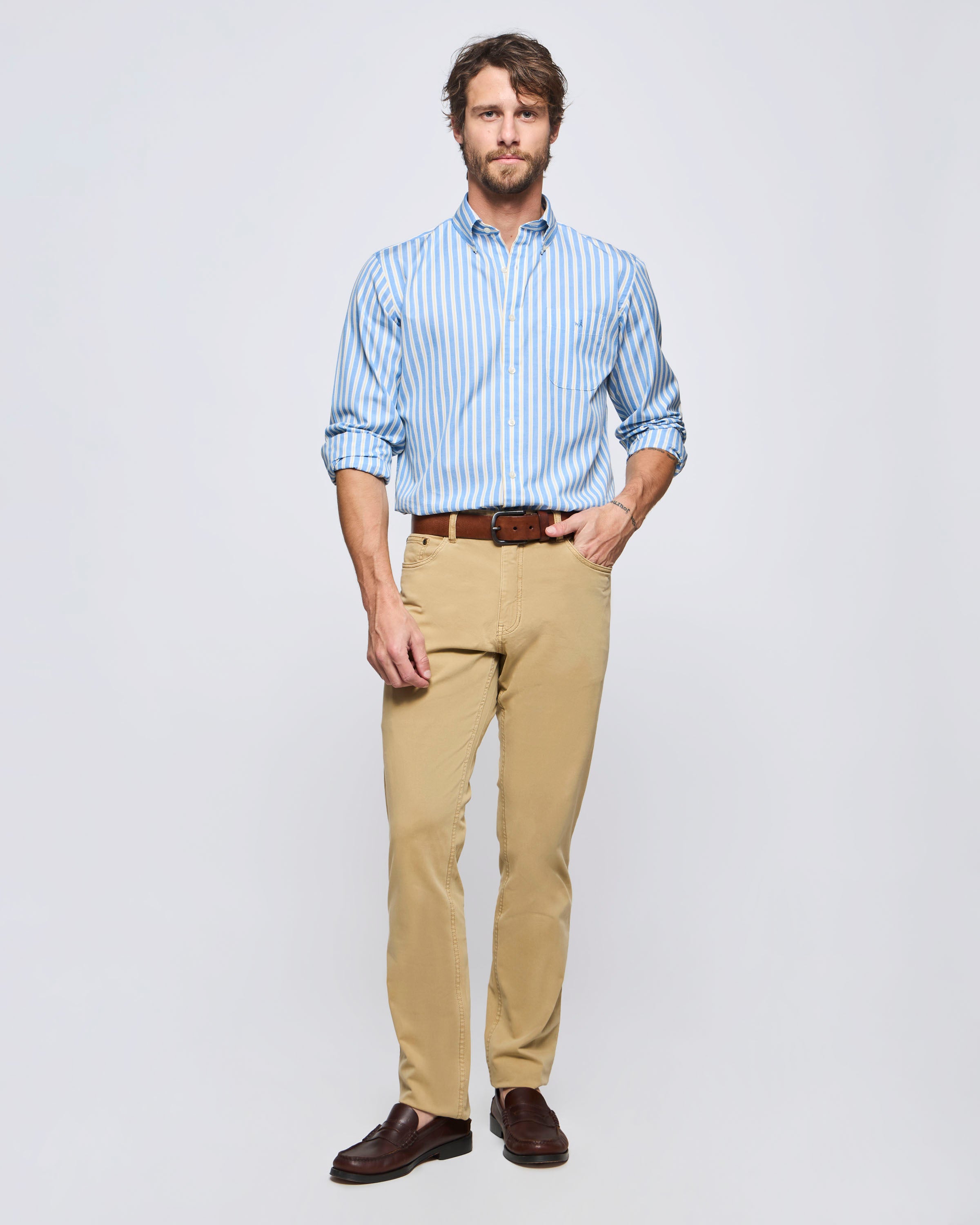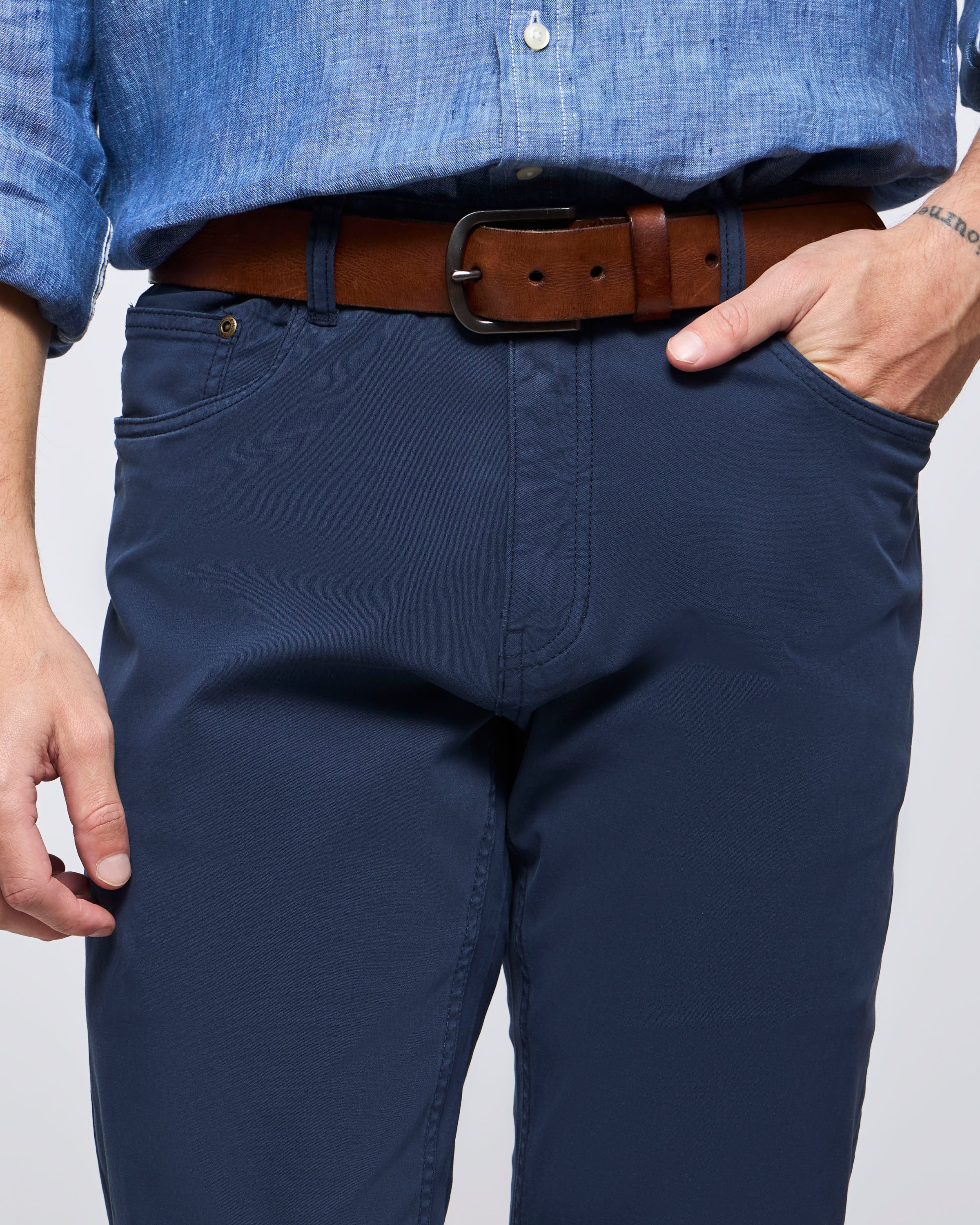 Nuestro clásico modelo 5 Pocket pero con un Calce Slim, de Tiro Regular pero mas Ajustado de Piernas y Bota. Este versión es Perfecta para usar en toda Ocasión, su Look Limpio y Elegante lo Hace Perfecto para ir a la Oficina o para el Fin de Semana. Viene en Canvas de Algodón Liviano con un toque de Spandex para un mayor comfort. Especial para los días de Verano, es el Pantalón perfecto para usar todos los días.