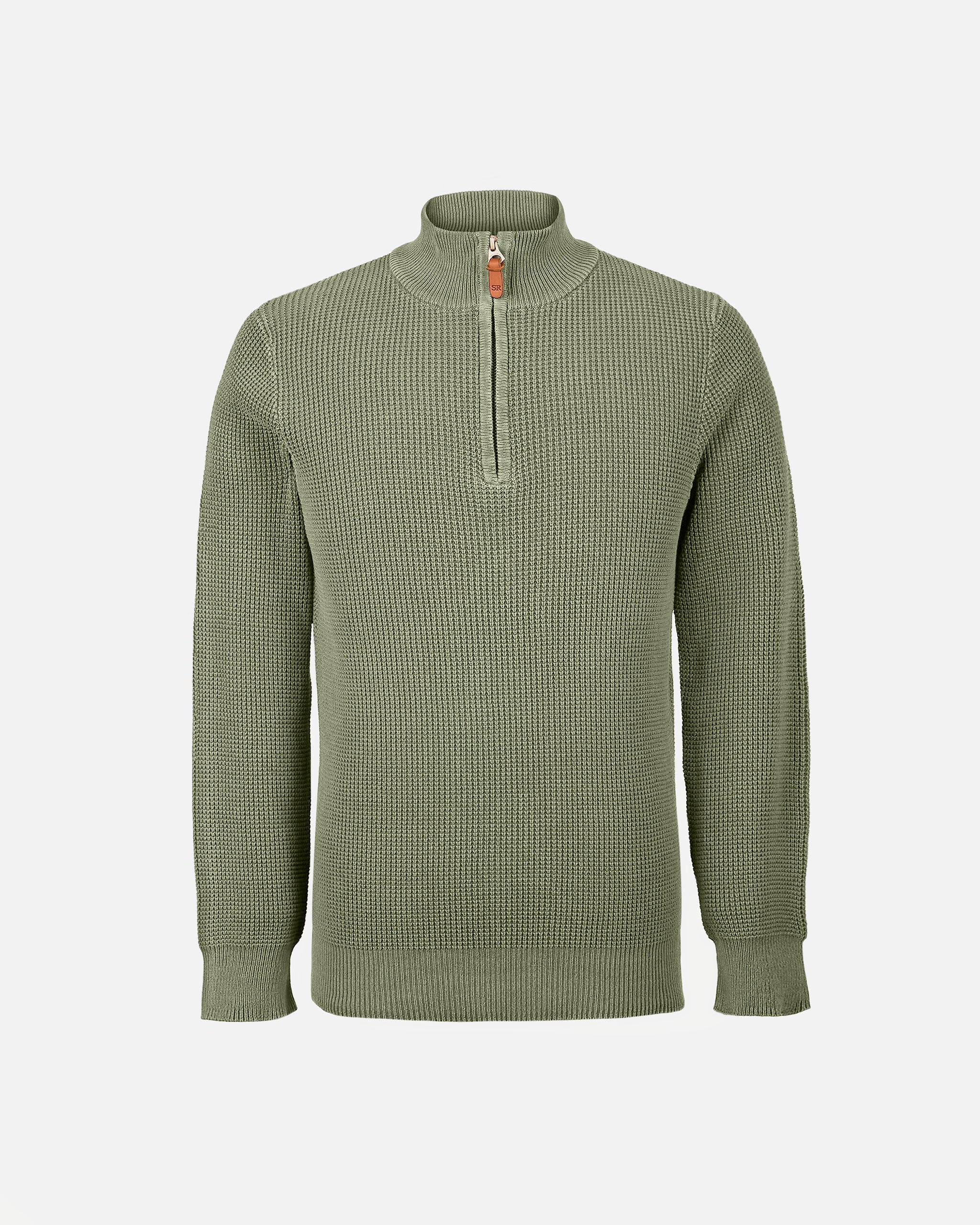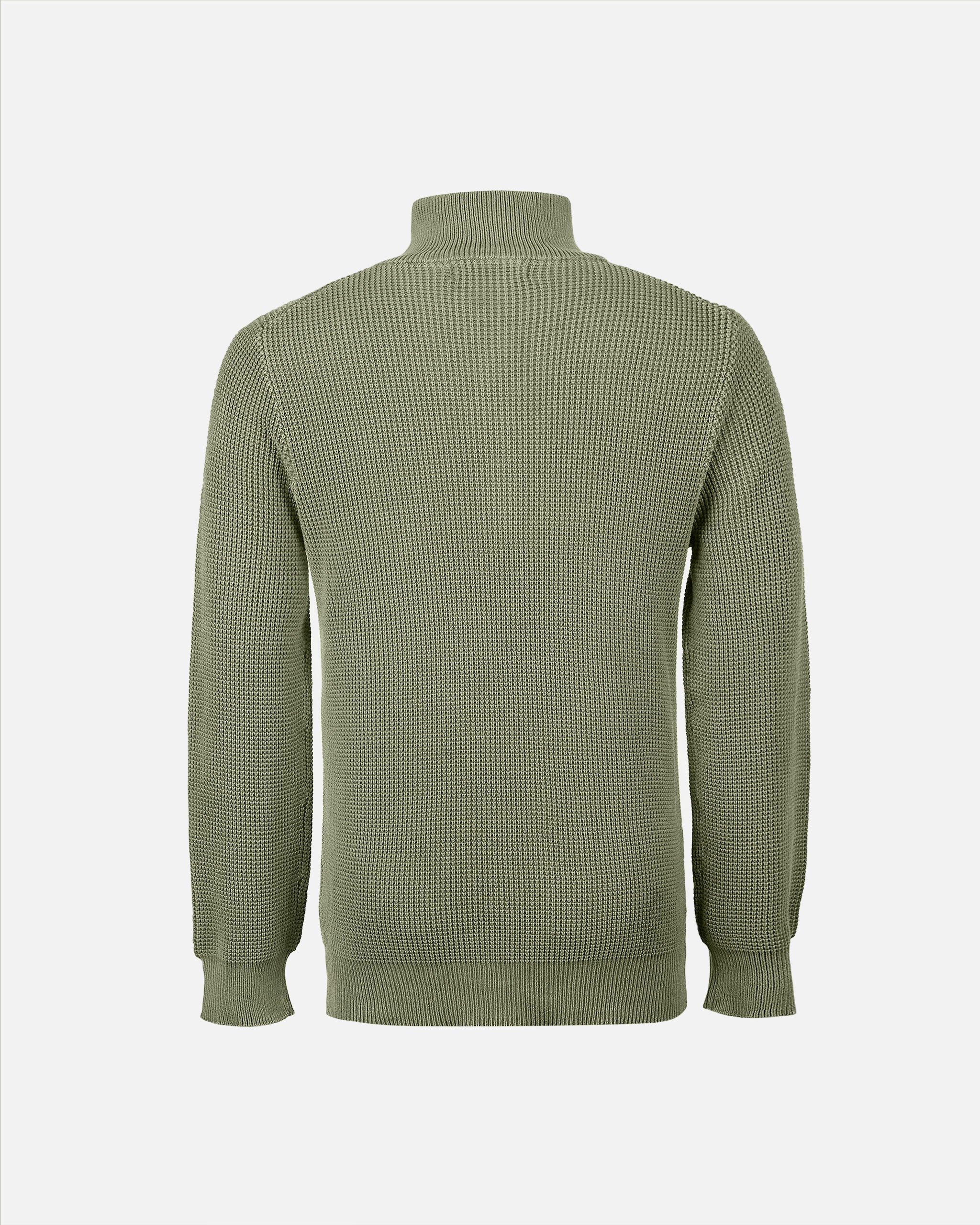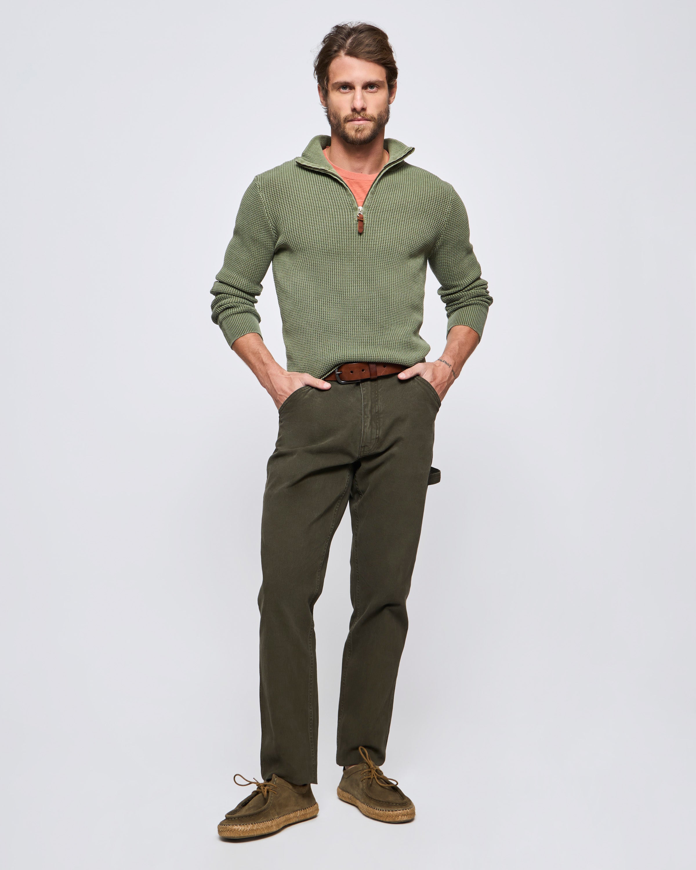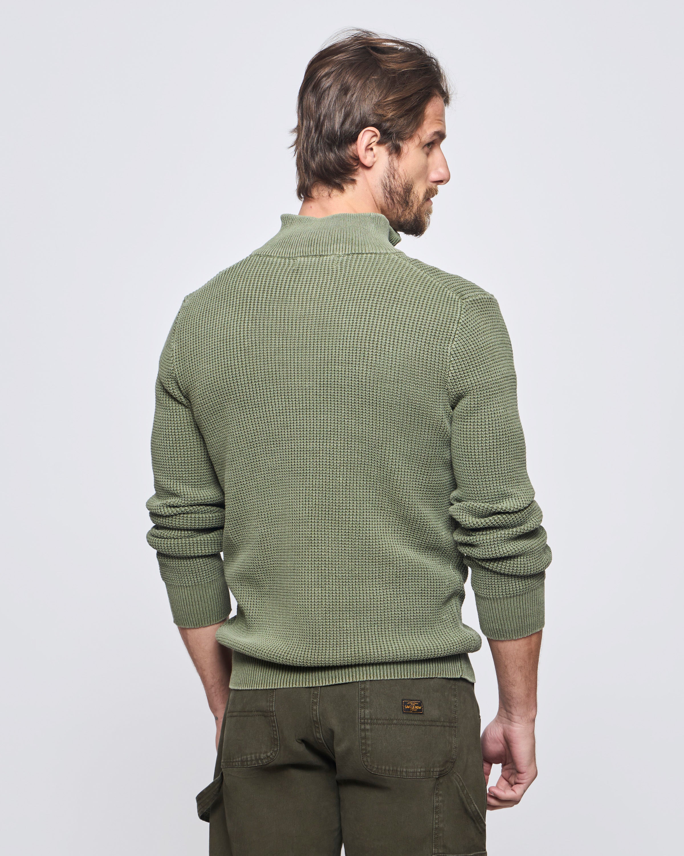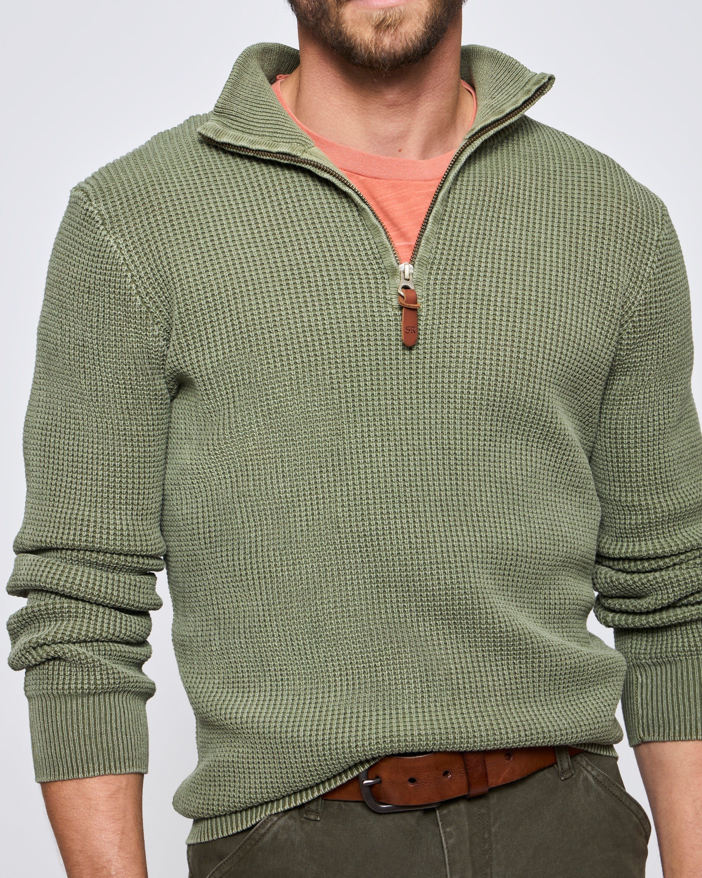 Inspirado en Sweaters Militares. Teñido en prenda con un tejido Waffle para lograr un "Heritage Look". Es fácil de usar, cómodo y se bien prácticamente con todo. EL compañero perfecto para las frescas tardes de Verano.