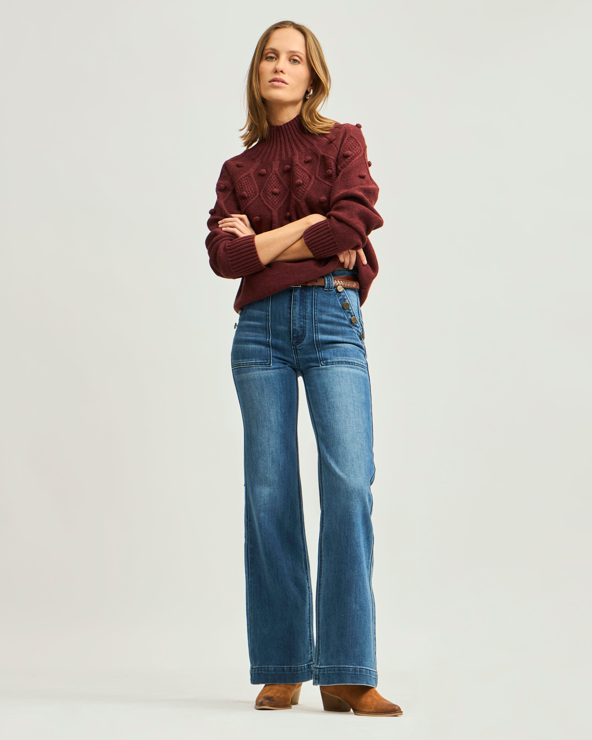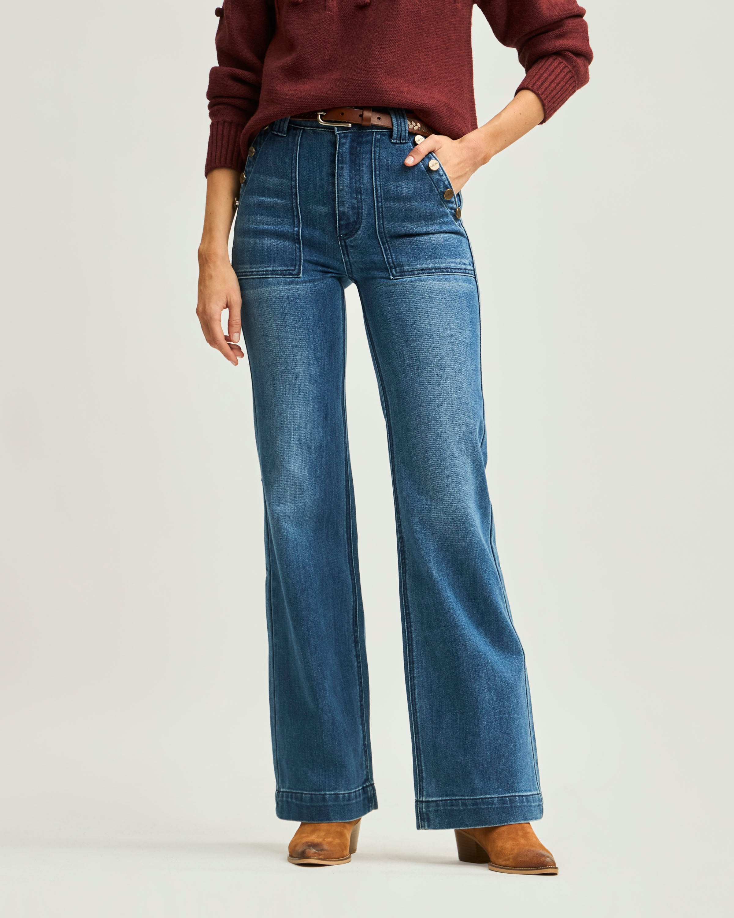 Jeans Tiro Alto Bota Ancha Botones