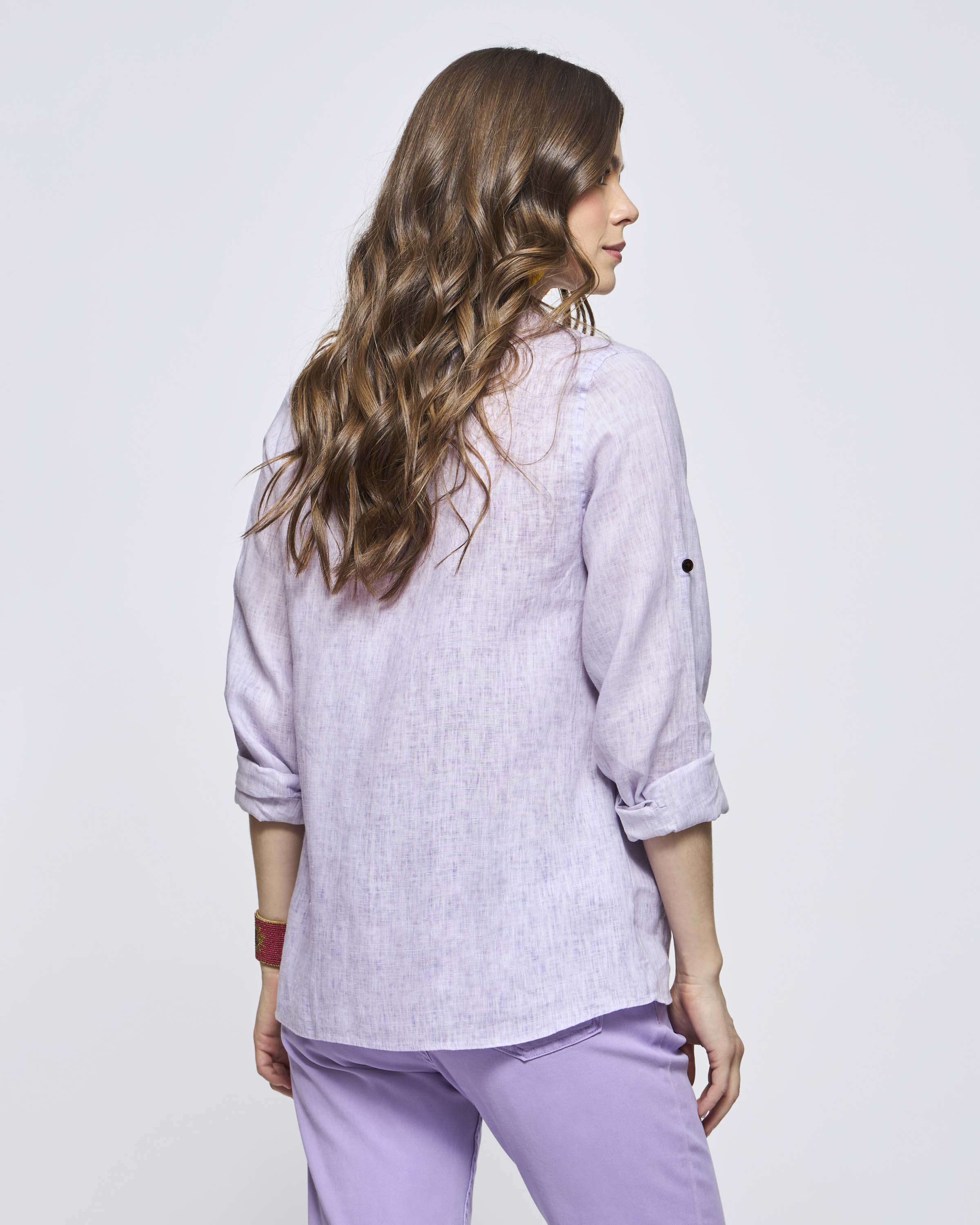 Blusa Safari Lino Cuello a la Base Manga Larga Bolsillos