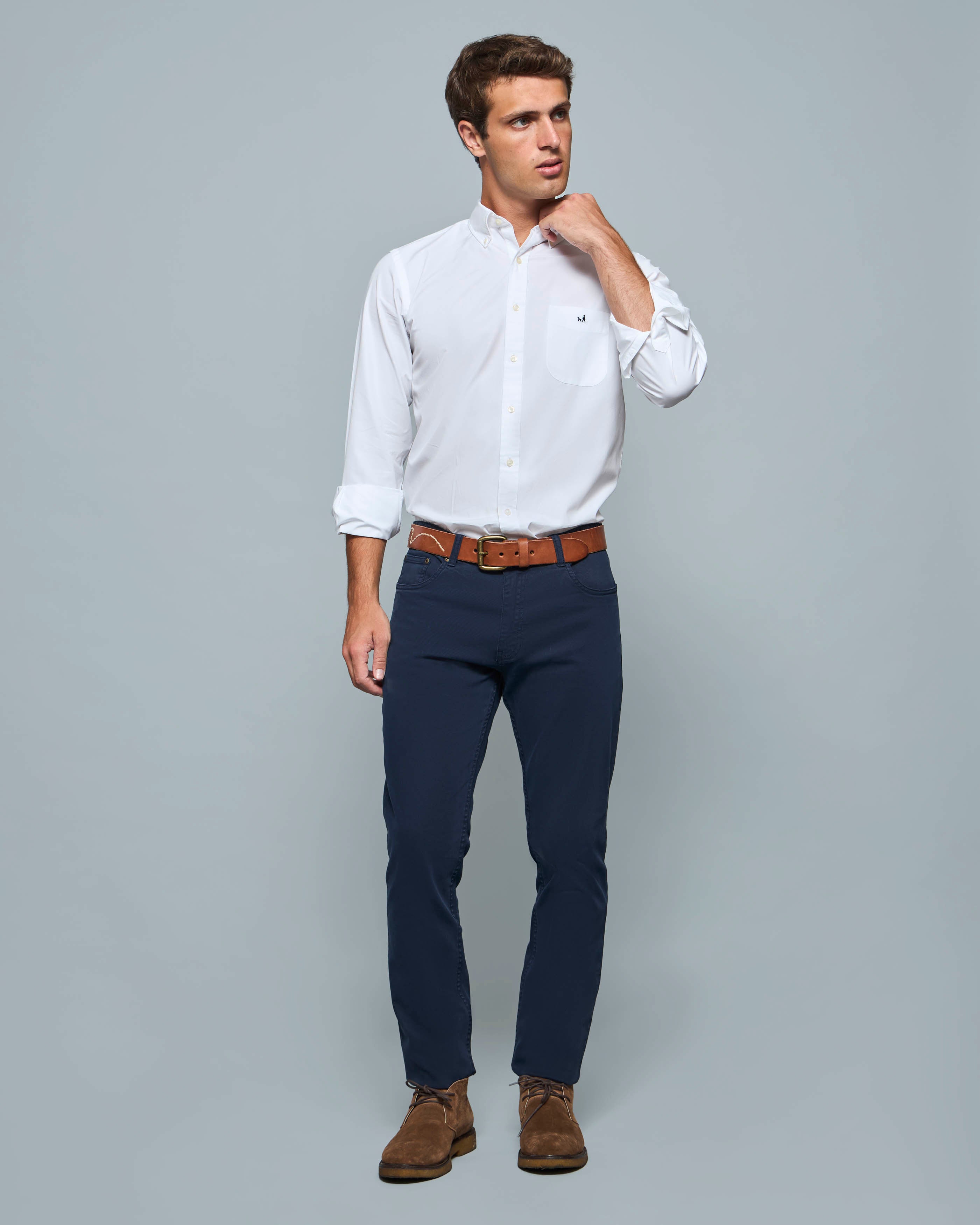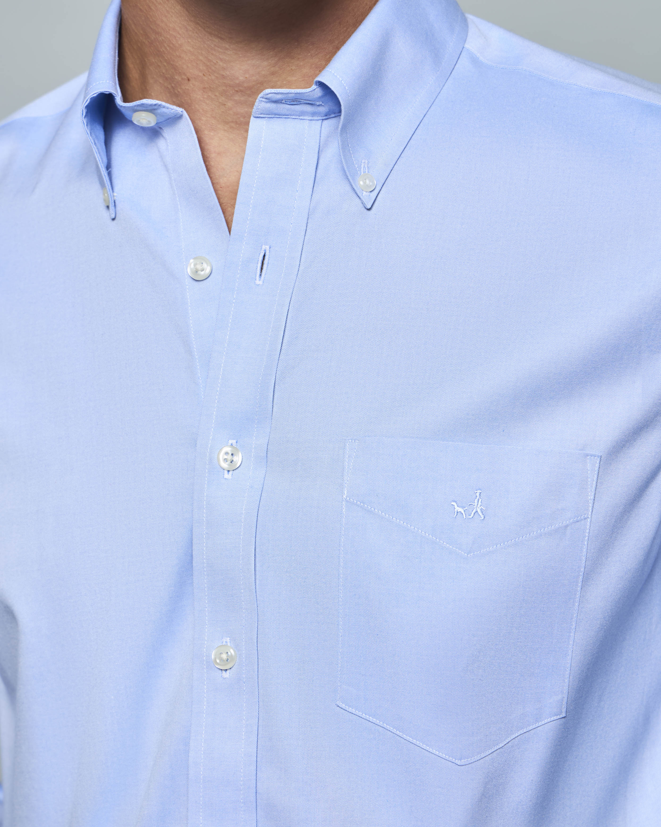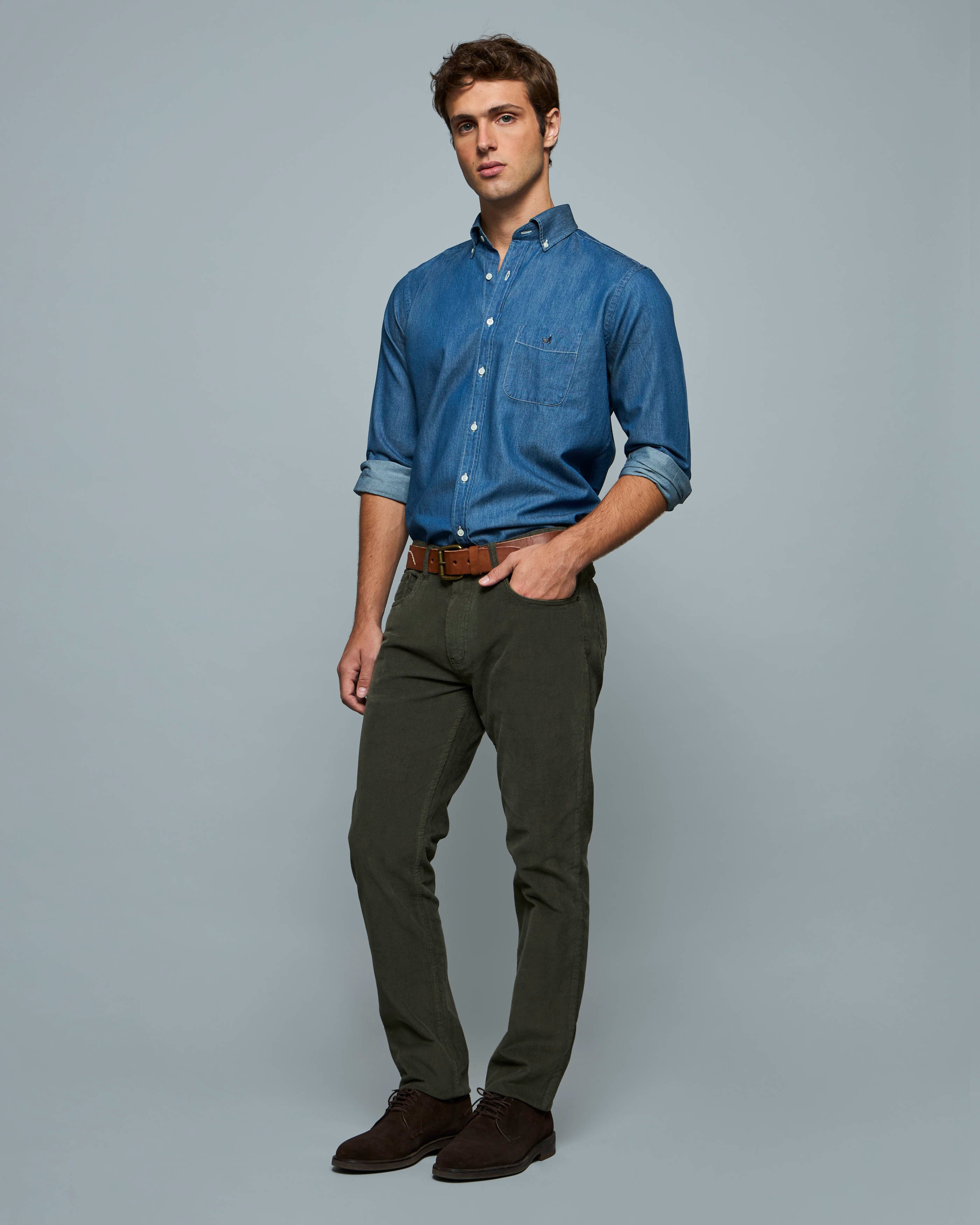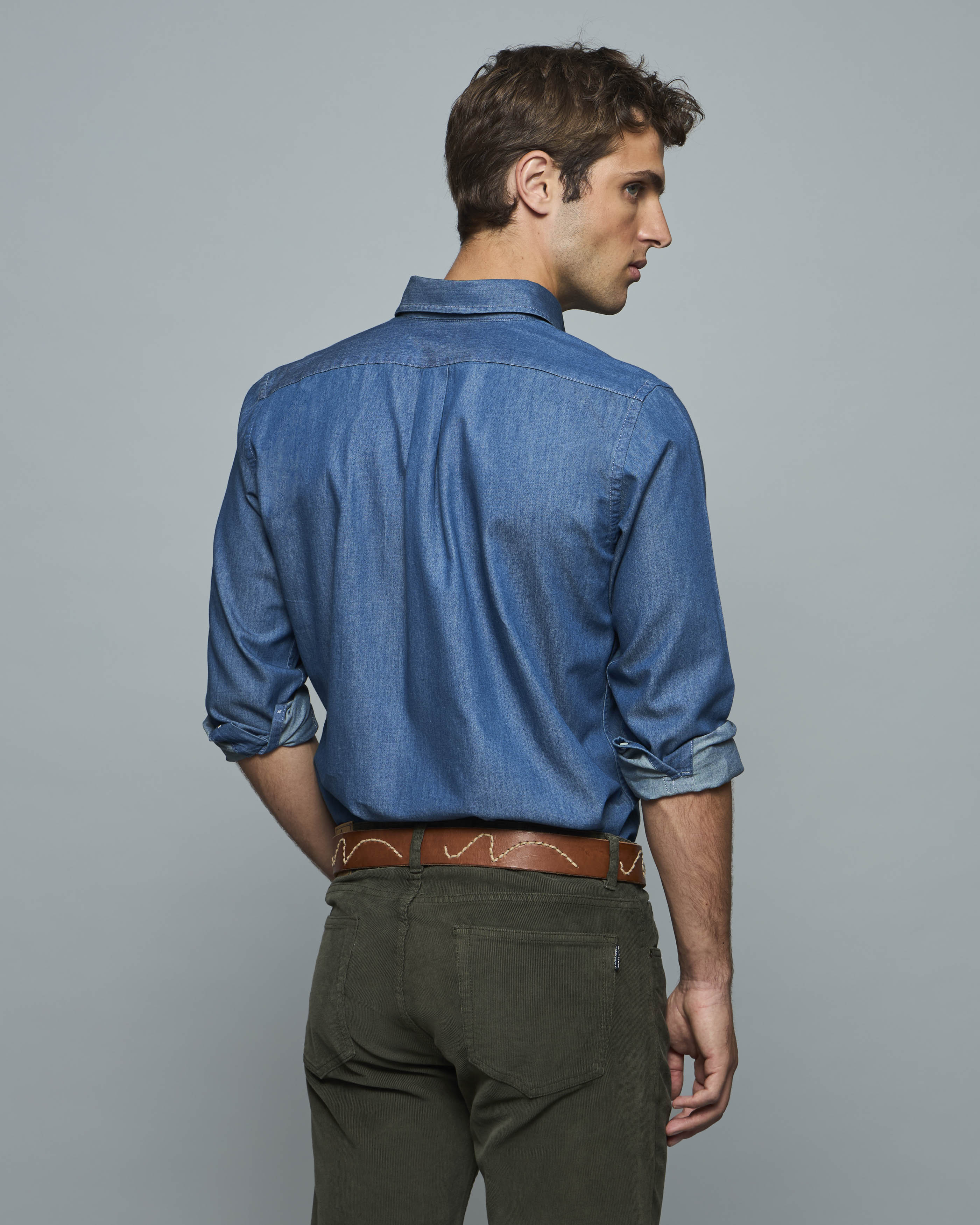 Camisa Button Down Manga Larga Lisa Chambray Indigo Sport