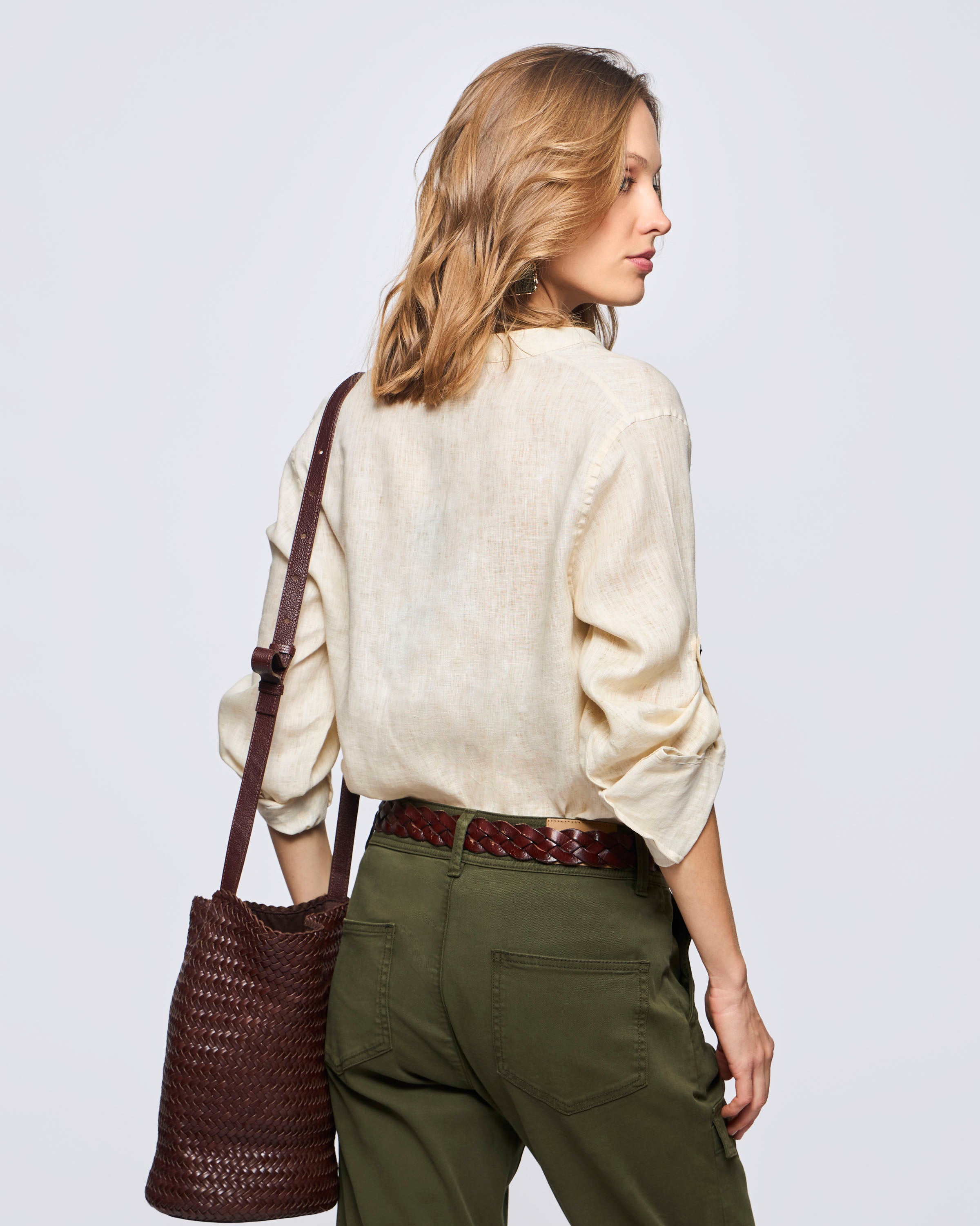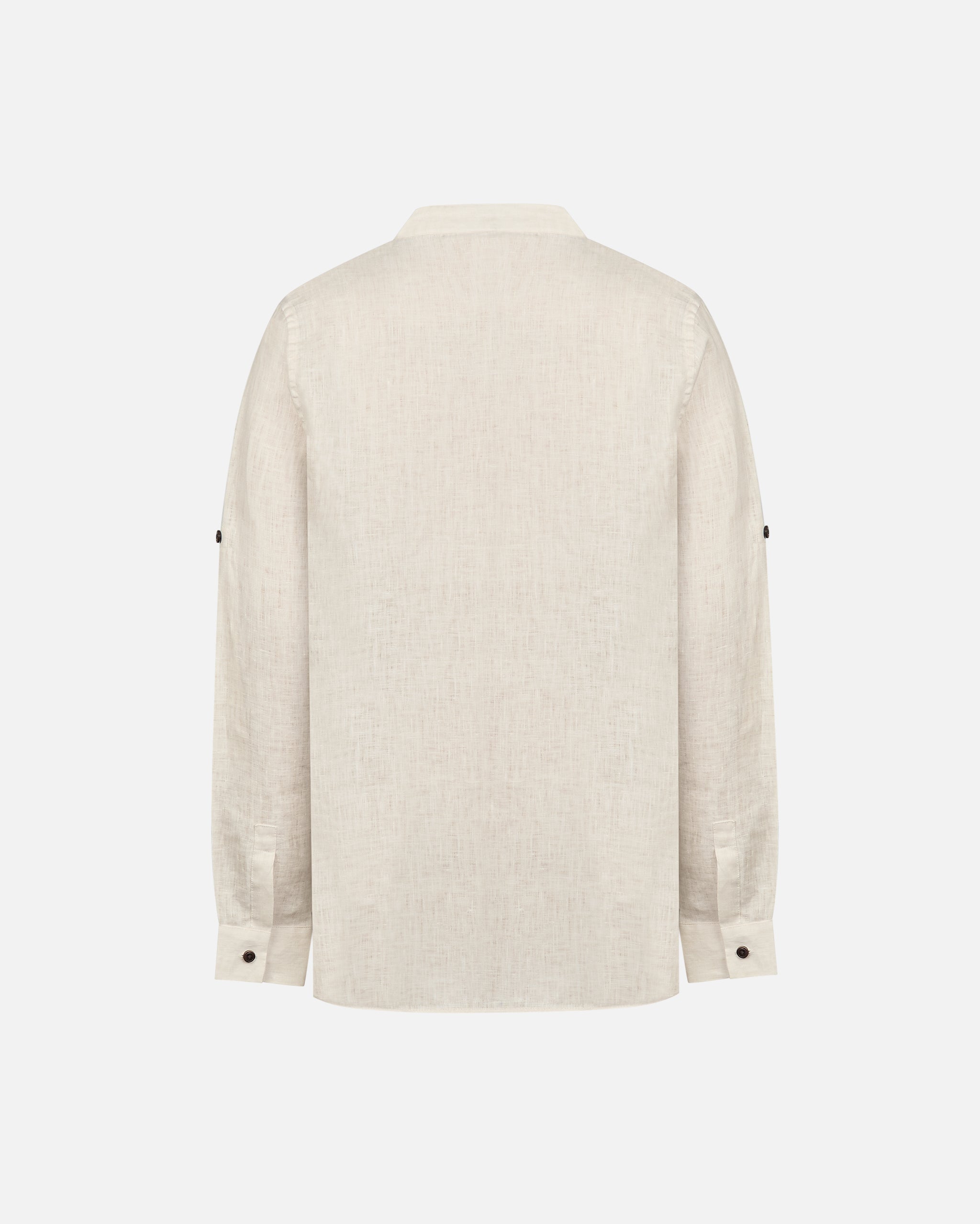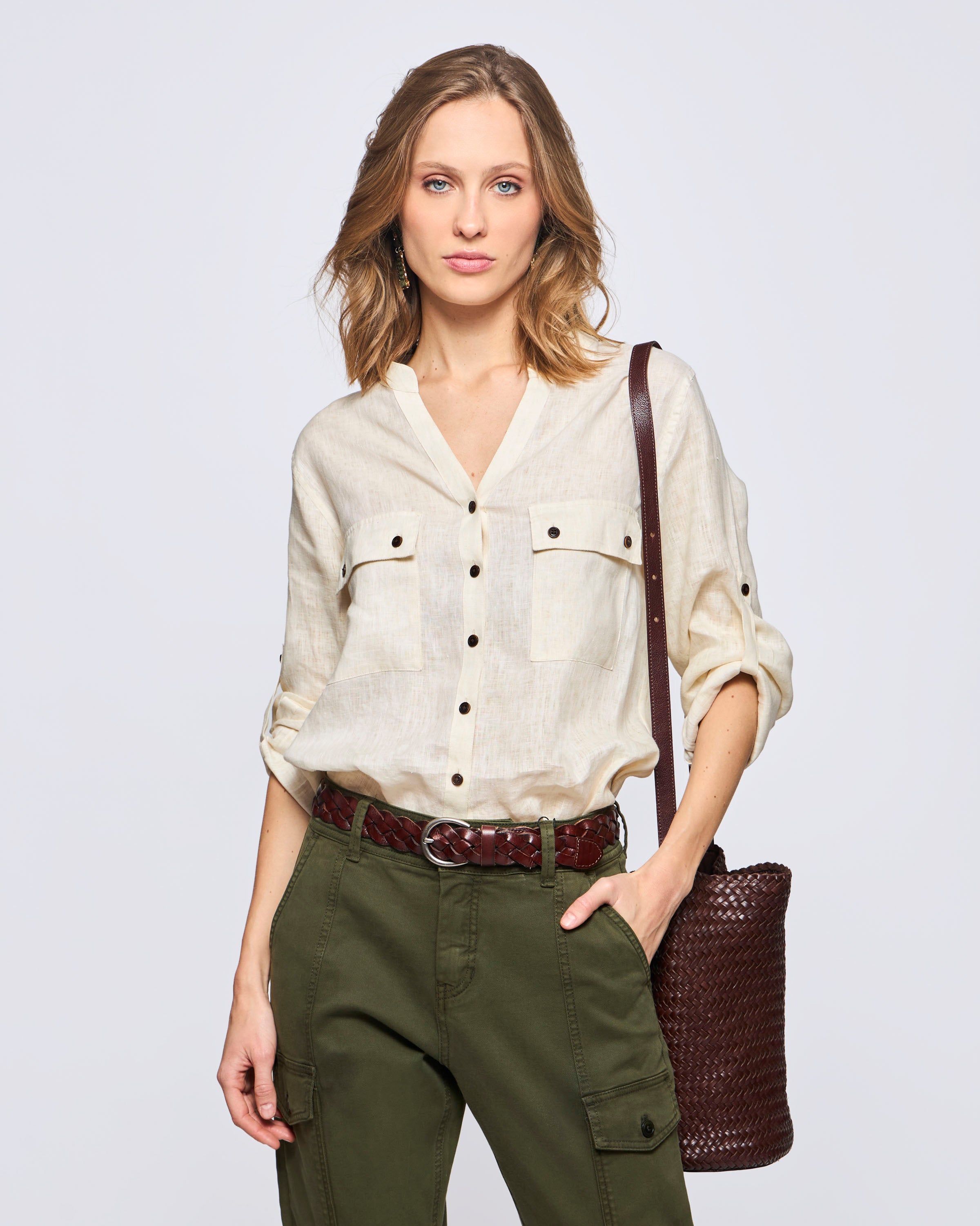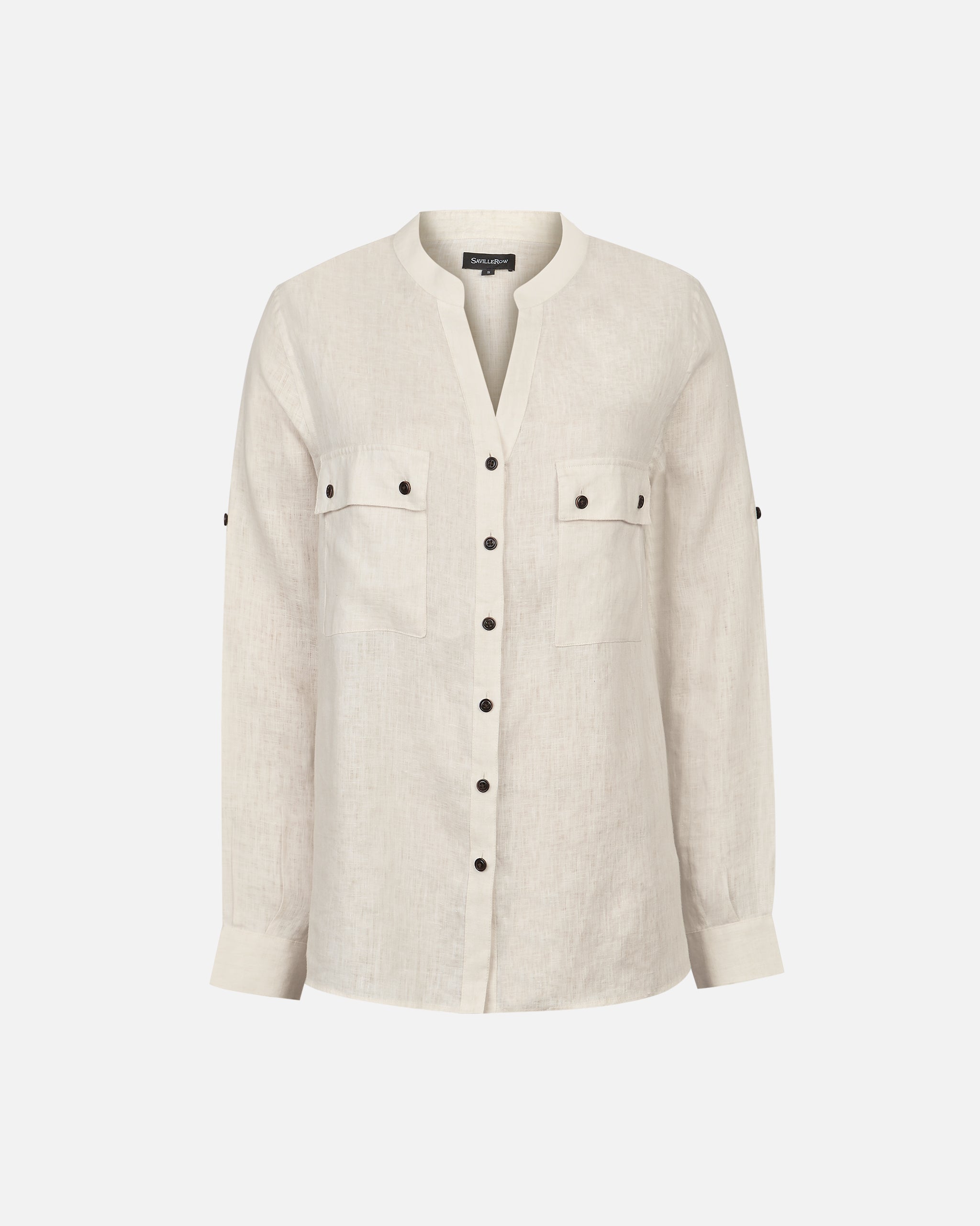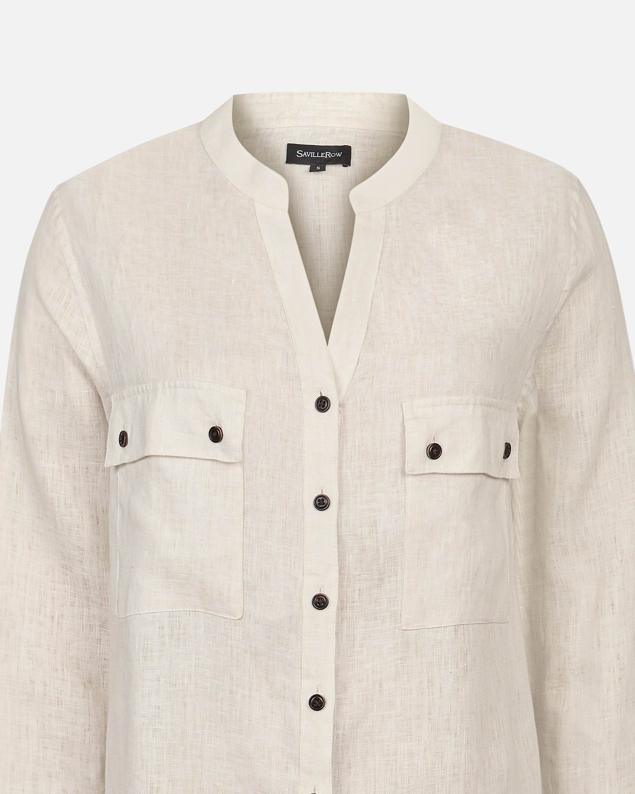 Blusa Safari Lino Cuello a la Base Manga Larga Bolsillos