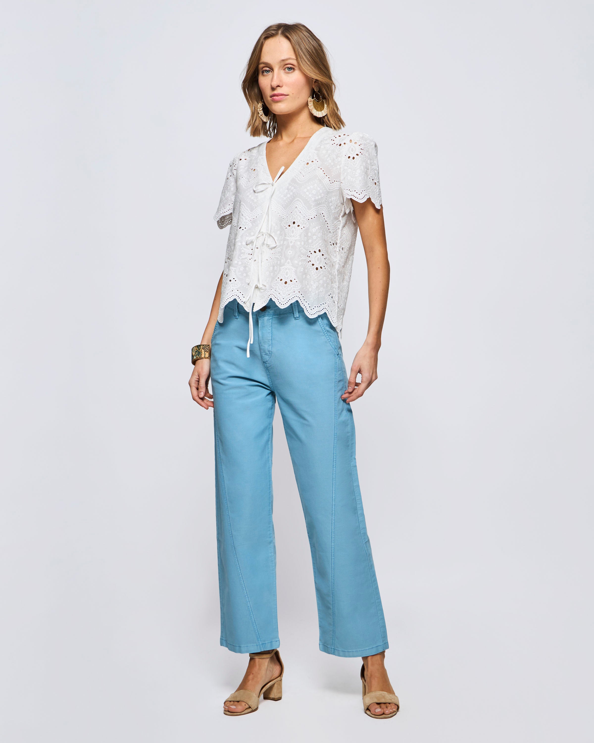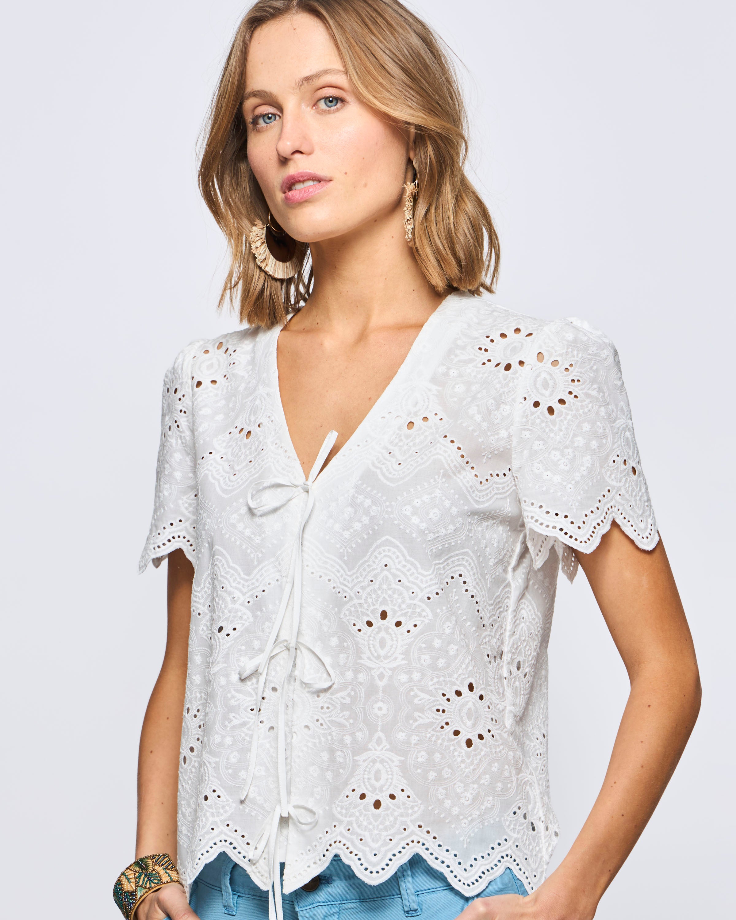 Blusa Manga Corta En Broderie Con Amarritas